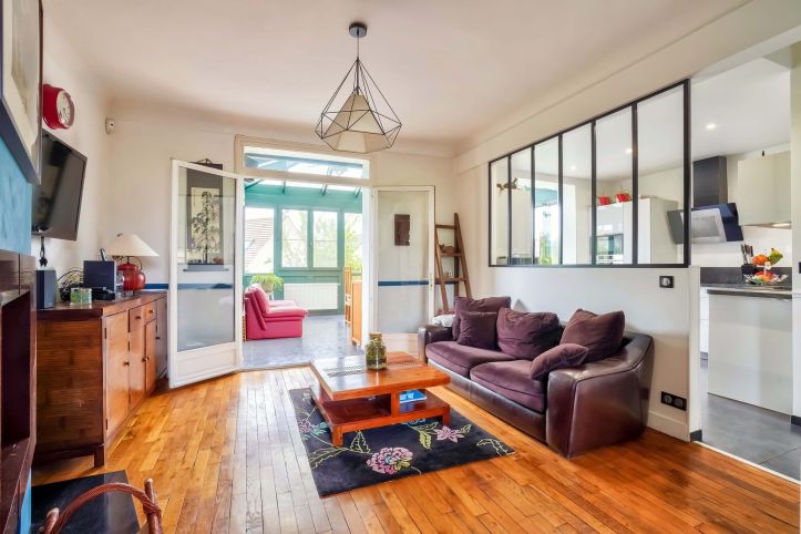 L’entrée avec ses cimaises murales mène au double séjour baigné de lumière, agrémenté d'une cheminée et orné d'un parquet d'époque, témoignage du charme d'antan. Une verrière subtilement intégrée sépare l’espace salon convivial de la cuisine récemment rénovée et dont le volume permet de recevoir un coin dînatoire.