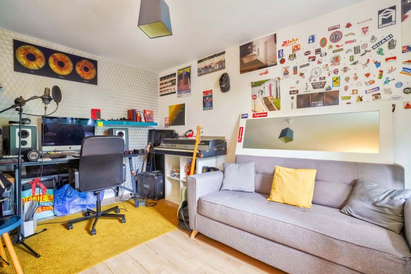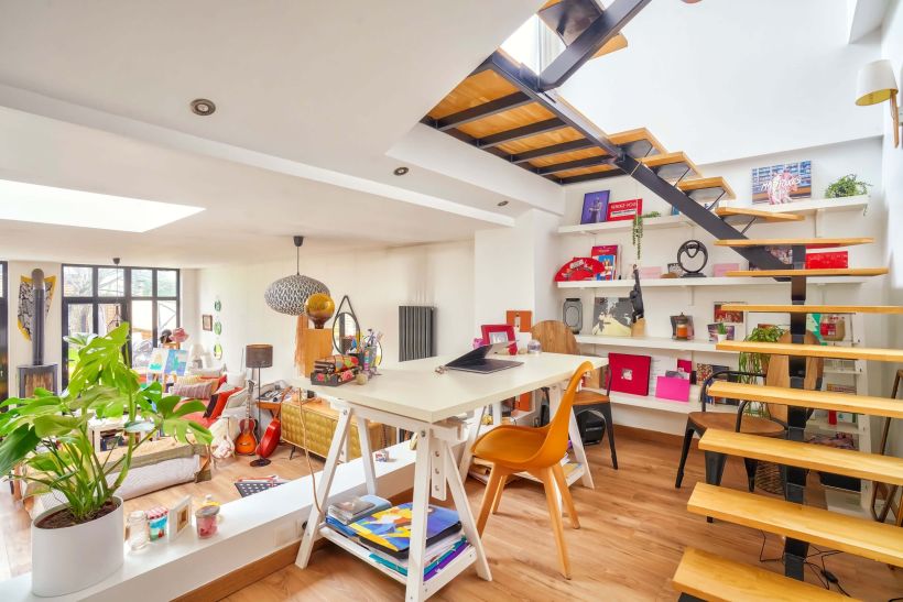 A quelques envolées de marches supérieurs se trouve un espace bureau qui surplombe le séjour et un espace nuit composé de deux chambres et une salle de bain.