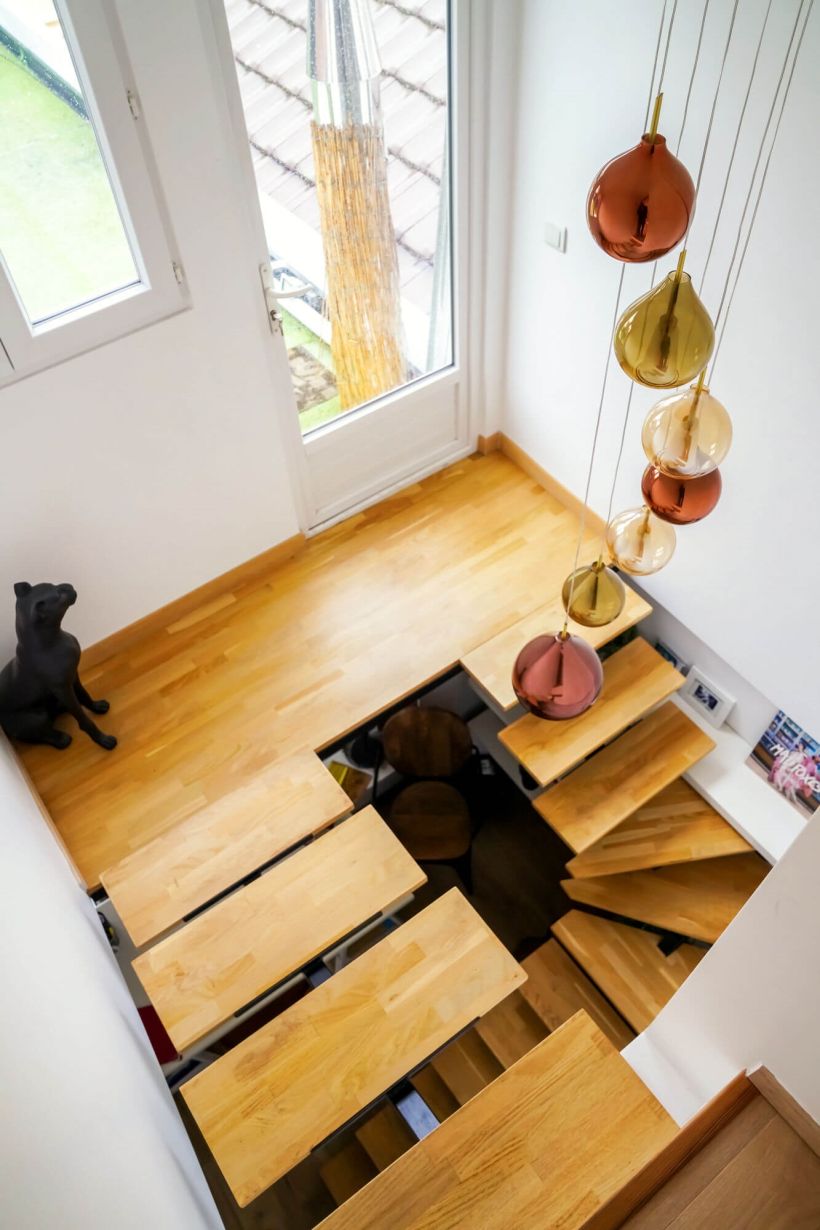 Dès l’entrée, le ton est donné par l’originalité du lieu. L’entrée s’ouvre sur un petit salon dont la fonction pourrait être détournée à la guise des futurs propriétaires. Une première chambre prend place sur ce niveau ainsi qu’une salle d’eau.