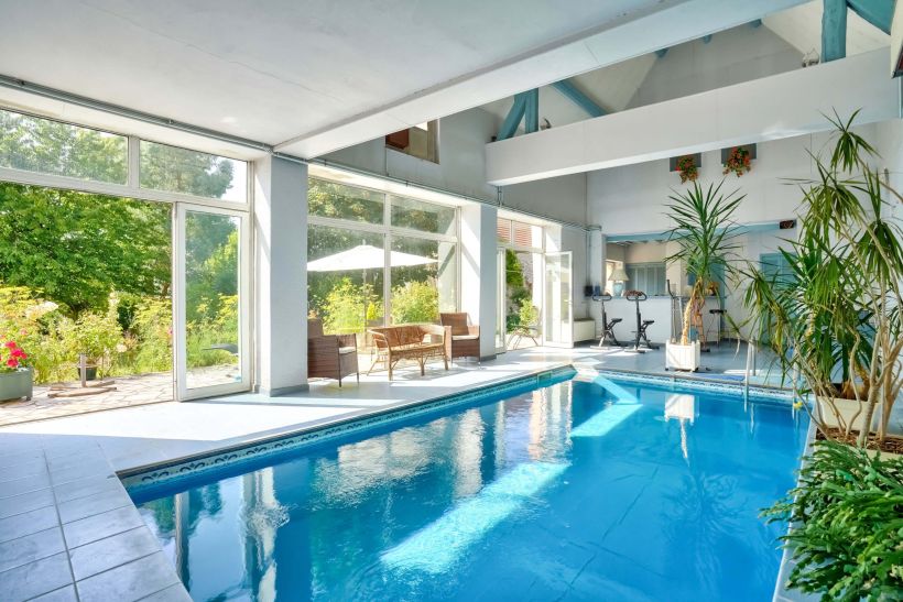 Dotée d'une belle hauteur sous plafond et de grandes baies vitrées, la pièce de 85m2 qui accueille la piscine entièrement chauffée permet de profiter d'une luminosité naturelle exceptionnelle et d'une vue sur la terrasse et le jardin. Elle dispose également d’un bar, idéal pour recevoir les invités dans un cadre unique et convivial.