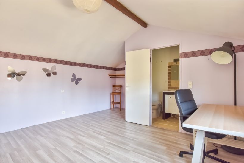 L'ensemble est complété par une extension indépendante de 40 m², véritable atout pour une activité libérale ou une vie de famille évolutive. Cette aile propose un vaste bureau en rez-de-jardin ainsi qu’une suite d'invités avec chambre et salle d’eau à l’étage. À l’extérieur, un jardin clos et paisible vient parfaire ce lieu de vie idéal pour les acquéreurs en quête de grands volumes et d'une authenticité préservée dans un environnement naturel privilégié.