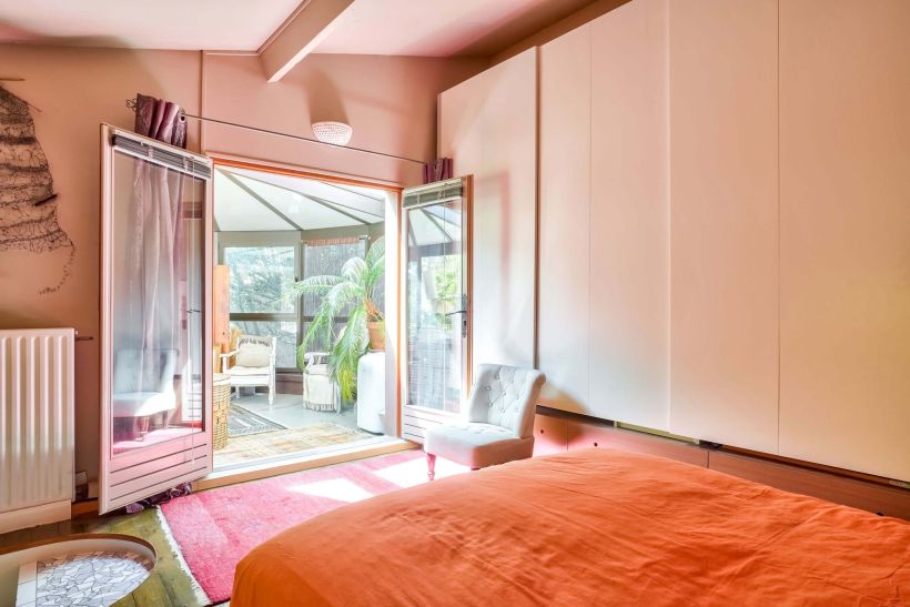 À l’étage, la suite parentale s’ouvre sur un bel espace de 24 m² avec salle de bain, dressing, et un accès à une véranda exposée plein sud. Une petite terrasse prolonge l’espace vers l’extérieur, avec une vue plongeante sur le jardin.