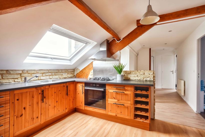 Dès l’entrée, la lumière naturelle et la douceur des volumes séduisent instantanément. Le salon, sous les poutres apparentes, s’organise autour d’une cuisine ouverte équipée, pensée pour les moments du quotidien comme pour les instants partagés. Ici, chaque recoin a été optimisé avec soin et goût, dans une rénovation qui allie confort moderne et cachet de l’ancien.