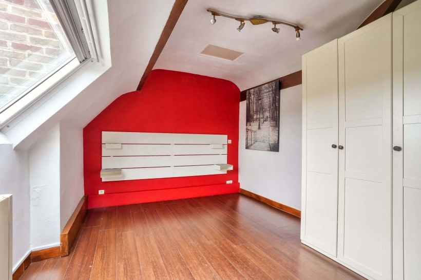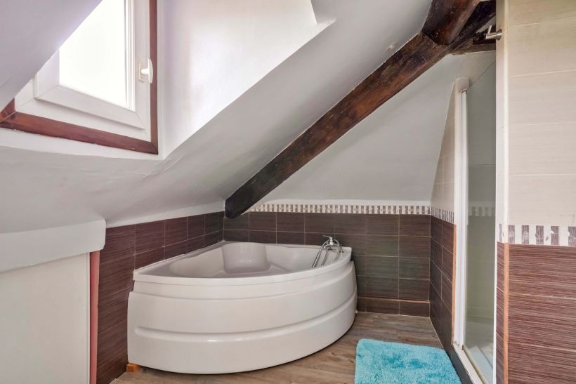 Le bien dispose de deux chambres, idéales pour une jeune famille ou un couple avec un enfant. La salle de bains, avec sa douche contemporaine, complète les espaces avec simplicité et fonctionnalité. Les toilettes sont indépendantes, un vrai plus dans un appartement sous les toits.
