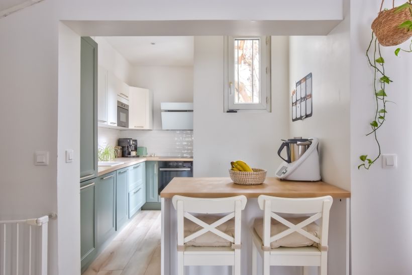 La cuisine, douce et fraiche avec sa teinte vert d’eau vient parfaire l’atmosphère générale de ce premier niveau qui se veut reposant et relaxant.