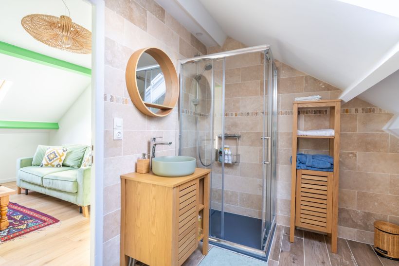 La seconde aile, pensée pour la vie de famille, propose au premier étage trois chambres qui se partagent une salle d’eau. Au second niveau, un espace d’environ 22m², déjà doté de sa propre salle d’eau offre de nombreuses possibilités : espace adolescents, suite invités, atelier créatif ou bureau indépendant.
