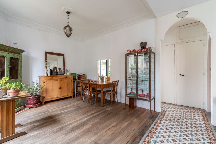 Dès l’entrée, les carreaux de ciment d’origine, parfaitement conservés, instaurent une ambiance chaleureuse et authentique. Le regard est immédiatement attiré par le parquet ancien, les moulures délicates, les hauteurs sous plafond et les passages cintrés qui rythment les volumes et soulignent l’élégance de l’ensemble.