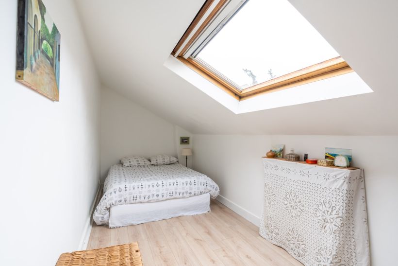 À l’étage, l’espace nuit se déploie autour de trois chambres, dont deux mansardées au charme indéniable, et une chambre spacieuse d’environ 16 m², complétées par un point d’eau.