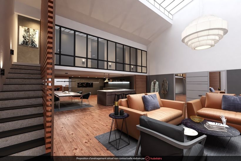La première projection visuelle illustre une interprétation contemporaine possible, mêlant esprit industriel, matériaux sobres et lignes épurées, tout en conservant les structures métalliques existantes.