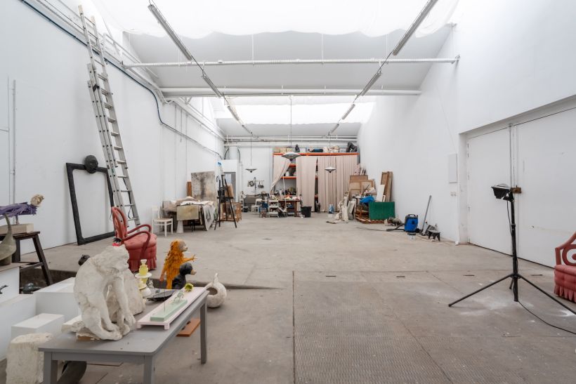 L’atelier se distingue par la présence de sa structure métallique de type Eiffel, véritable signature du lieu, qui rythme l’espace et témoigne de son passé industriel.