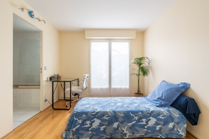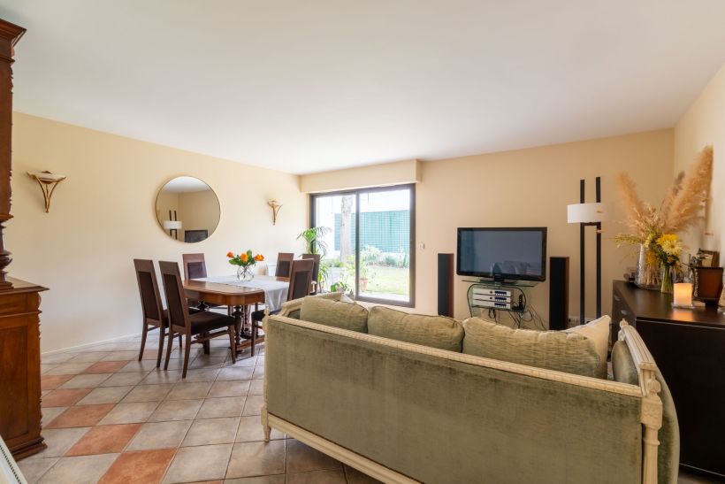 La pièce de réception d’environ 26 m², accueille un salon et une salle à manger aux proportions confortables. Les larges baies vitrées ouvrent directement sur le jardin et la terrasse, offrant une relation fluide entre intérieur et extérieur et une qualité de vie rare pour un appartement.