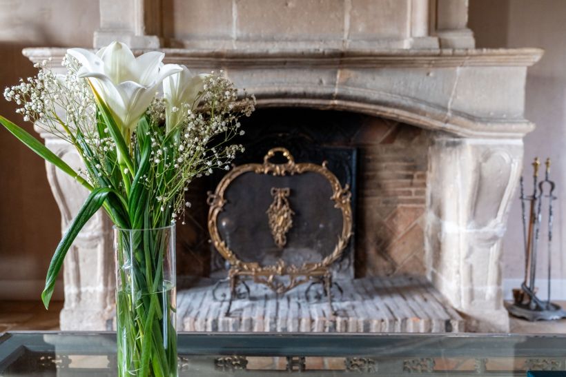 Le double salon, cœur de la maison, est un espace de vie central où s’exprime pleinement l’architecture intérieure. La cheminée monumentale du XVIIᵉ siècle — pièce patrimoniale intégrée — agit comme un pivôt spatial et émotionnel : elle rassemble, réchauffe et donne à l’espace une assise intemporelle. La salle à manger attenante prolonge cette séquence, avec une ouverture généreuse vers le jardin qui efface les frontières entre intérieur et extérieur.
