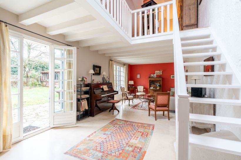 À gauche, l’escalier mène à un séjour installé à l’étage, largement ouvert sur le jardin. Le volume est prolongé par une mezzanine, qui accompagne la pièce et lui apporte une lecture verticale singulière, baignée de lumière.