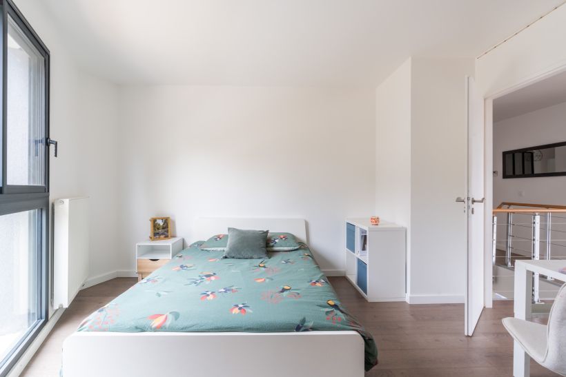 Le premier étage adopte une écriture plus fonctionnelle, volontairement sobre. Ici, les volumes sont rationnels, pensés pour un usage familial efficace. Les chambres, de dimensions équilibrées, offrent des espaces calmes et lumineux, faciles à aménager.