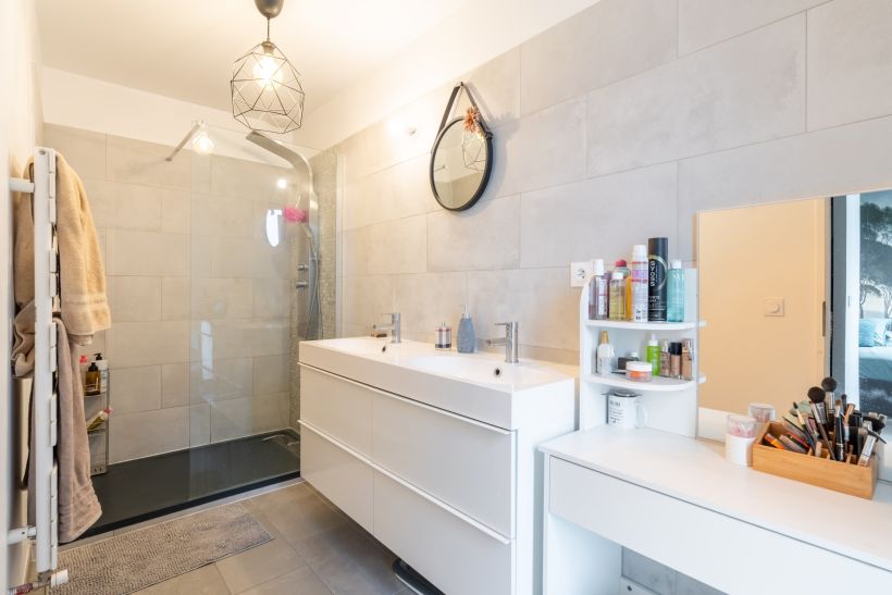 La salle de bain familiale, aux lignes contemporaines, répond aux usages du quotidien avec simplicité et efficacité. Une lingerie intégrée vient structurer ce niveau et faciliter l’organisation domestique. Enfin, un bureau adapté au télétravail ou aux besoins scolaires complète l’ensemble.