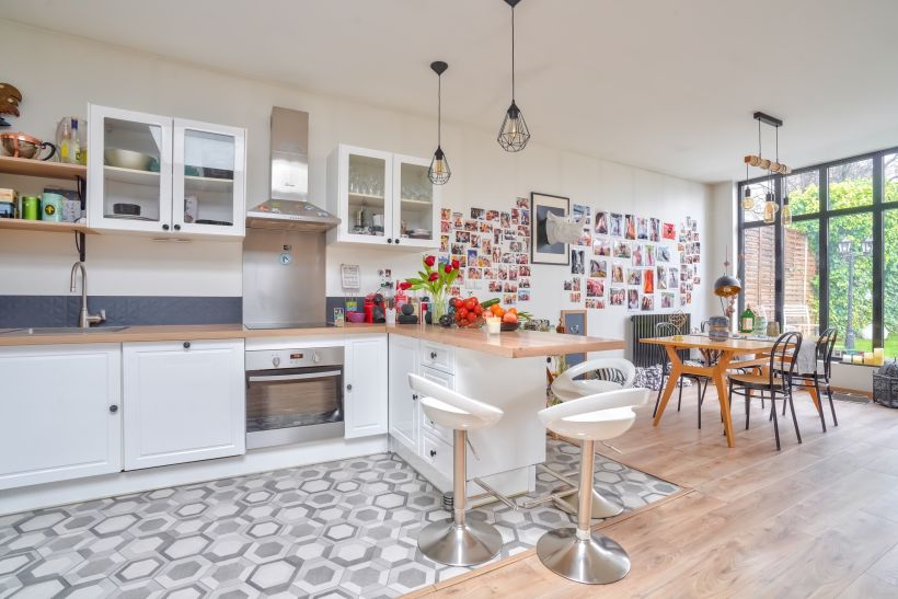 En montant quelques marches, une vaste pièce de vie incroyablement lumineuse, avec de grandes baies vitrées offre une atmosphère accueillante et chaleureuse accentuée par la présence d’un poêle à bois. Tandis que la cuisine américaine intégrée ajoute à la convivialité de l’espace. Celui-ci offre une vue sur la terrasse adjacente de 80m2. Cette continuité entre l’intérieur et l’extérieur créer un espace de vie harmonieux, idéal pour profiter des moments de détente et de convivialité.