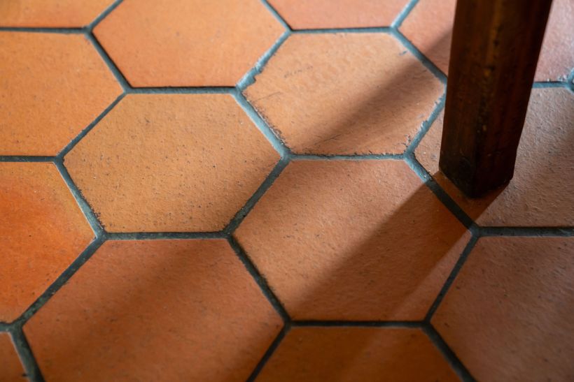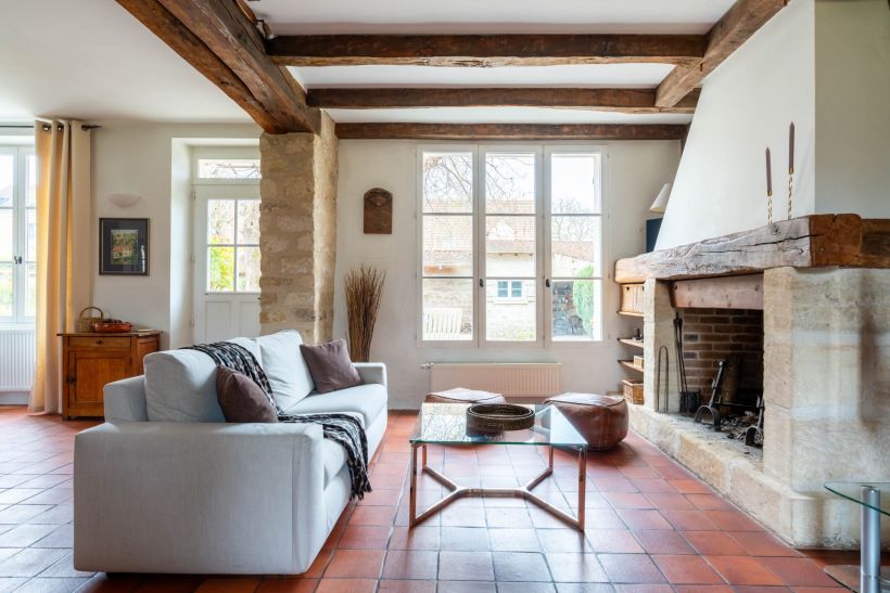 Le seuil franchi, un vaste séjour de près de 50m2 s'ouvre sur la cour et le jardin par de larges fenêtres à petits bois. Poutres apparentes patinées, cheminée à manteau de bois brut, tommettes anciennes : l'espace porte les marques d'une architecture intérieure honnête et généreuse.