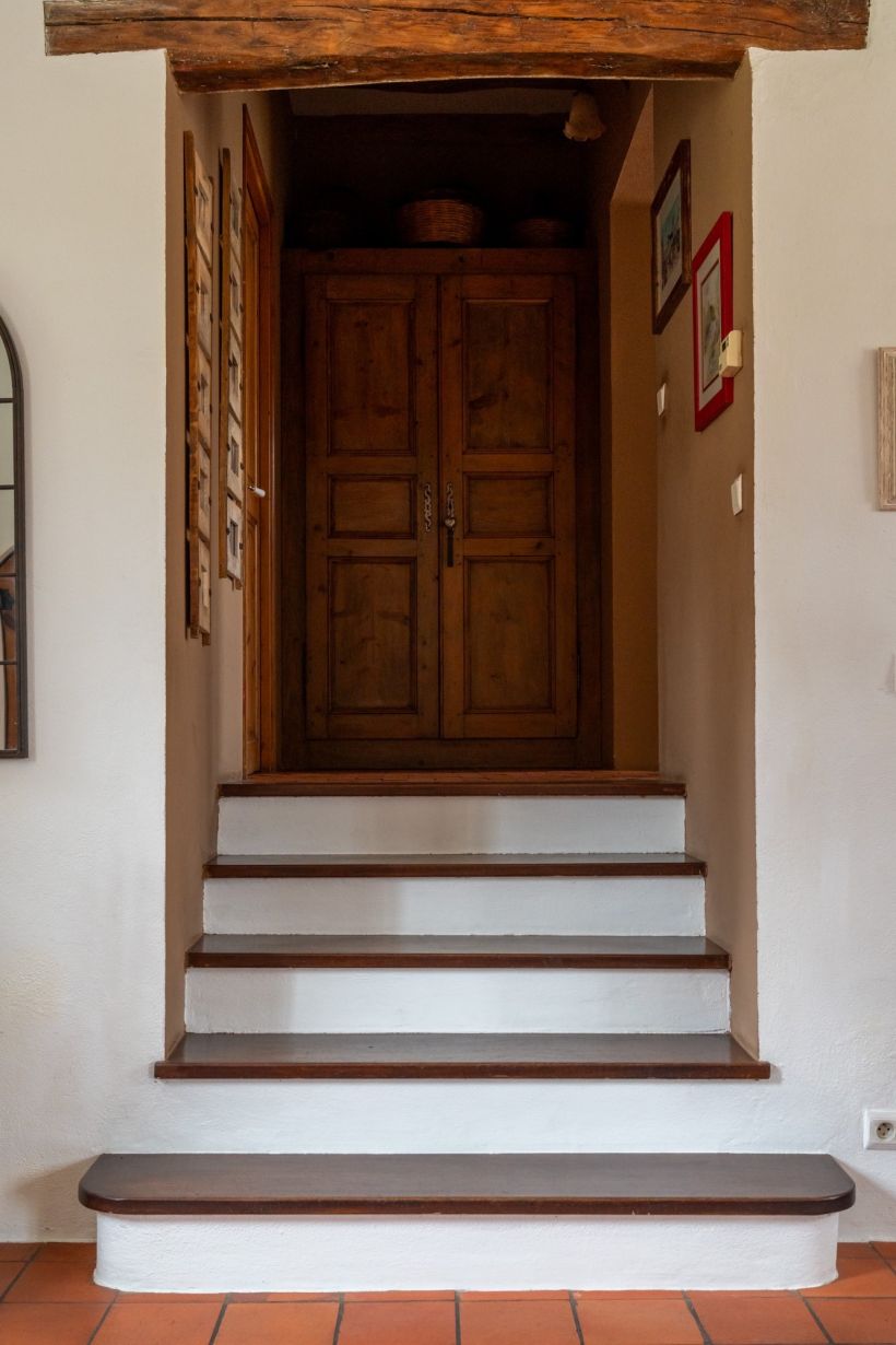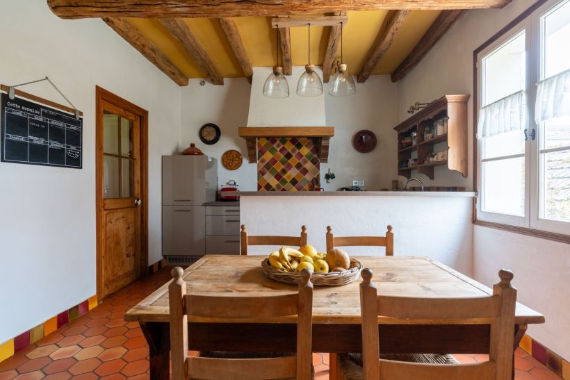 Une courte volée de marches mène à la cuisine indépendante, lovée sur son propre palier comme un espace à part, intime et chaleureux, avec ses faïences multicolores en éventail. Un cellier avec placards en prolonge discrètement le fond.