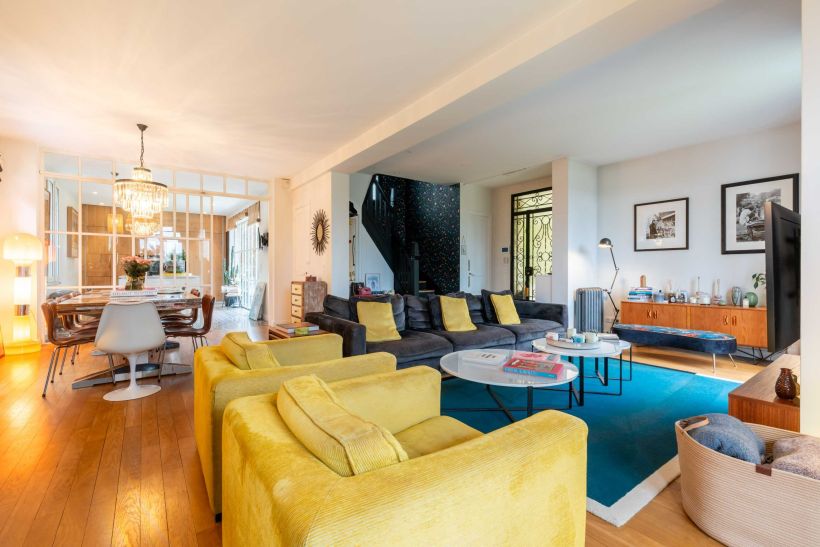 un magnifique double séjour de près de 50 m², baigné de lumière, rythmé par une cheminée qui invite aux soirées chaleureuses.