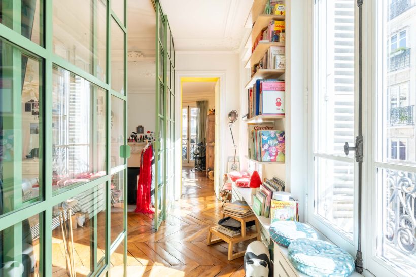 Dès les premiers pas, le regard se perd entre les moulures délicates, les cheminées en marbre d’époque, les grandes fenêtres bois en double vitrage et crémones à l’ancienne et le parquet en point de Hongrie parfaitement conservé.