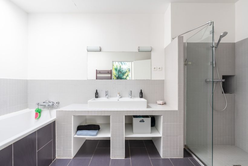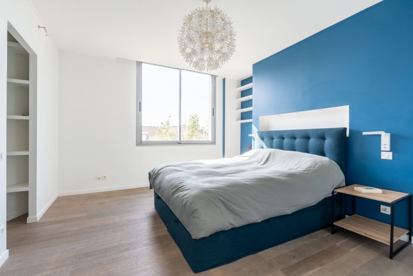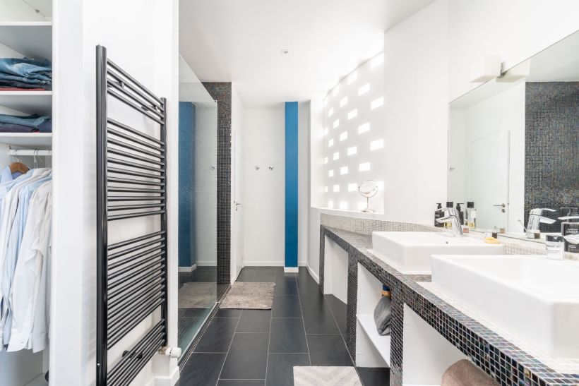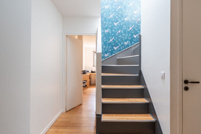 L’escalier mène à l’étage dédié à la partie nuit. Deux chambres se partagent une salle de bains, tandis qu’un espace bureau prend place sous un puit de lumière, apportant un cadre de travail agréable et lumineux. Une suite parentale avec salle d’eau privative et dressing vient parfaire ce niveau.