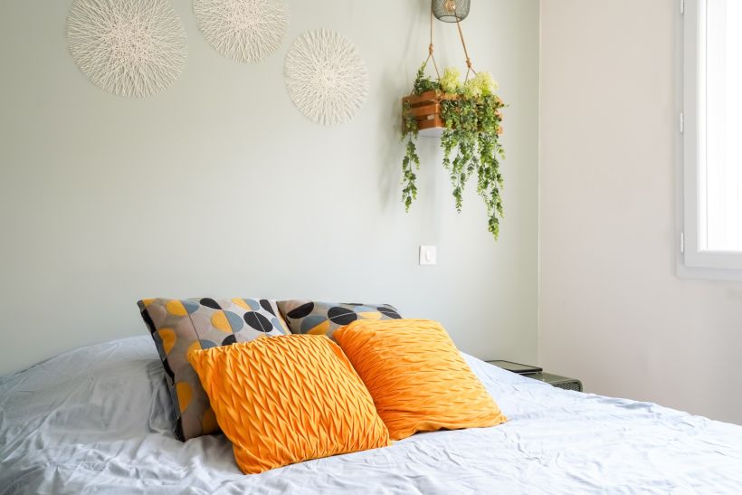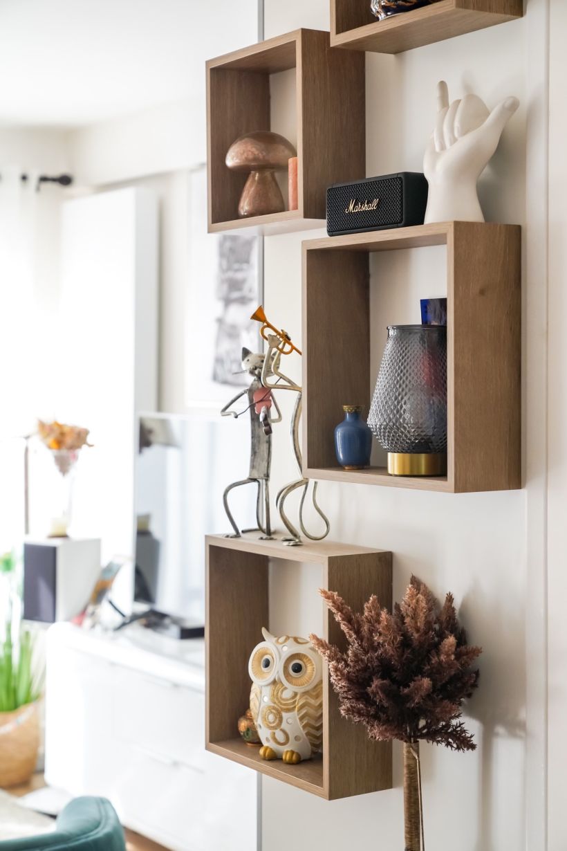 L’entrée distribue une spacieuse cuisine vêtu de blanc et sa touche de peps apportée par la crédence géométrique. Et sur une pièce de vie lumineuse accueillant d’un côté la salle à manger et de l’autre le salon. Ce premier espace totalise 35m2.