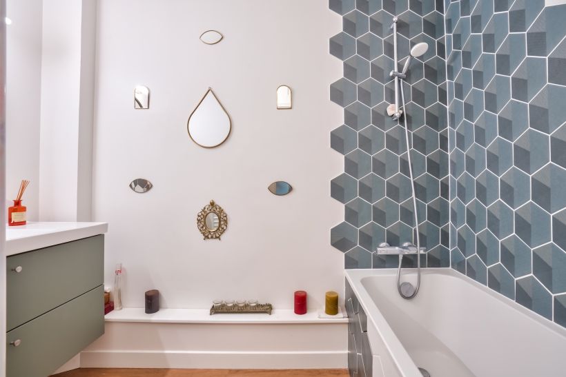 L’espace nuit composé de deux belles chambres avec placard se partagent une salle de bain rénovée très récemment et habillée de carreaux effet ciment à la forme cubique.