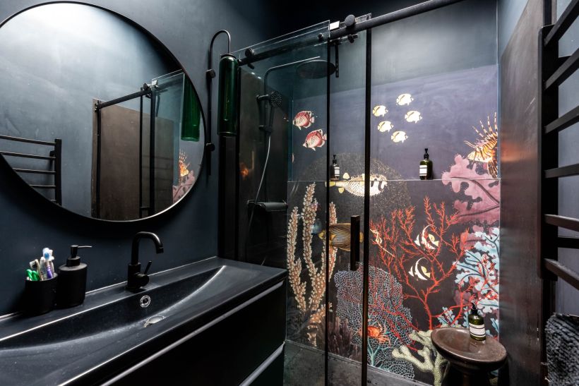 L'espace de vie est traité comme un plateau ouvert : salon, salle à manger et cuisine s'enchaînent sans rupture, dans une lecture horizontale que la lumière vient accentuer tout au long de la journée. Les matériaux donnent le ton ; béton ciré au sol, structure métallique apparente, verrières acier, cuisine linéaire intégrée. L'ensemble forme un intérieur cohérent, à l'esthétique industrielle assumée, où rien ne paraît ajouté après coup.